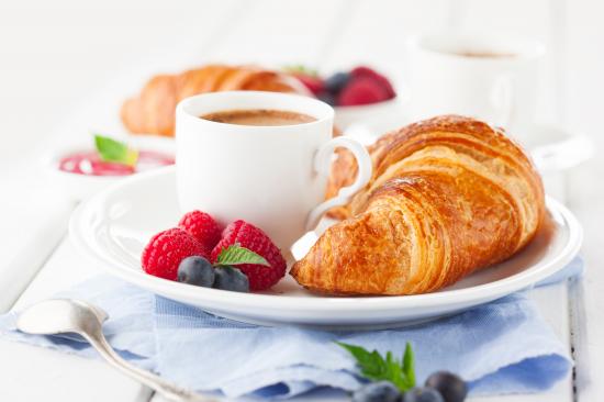 Wallpaper A cup of coffee on a plate with croissant and berries