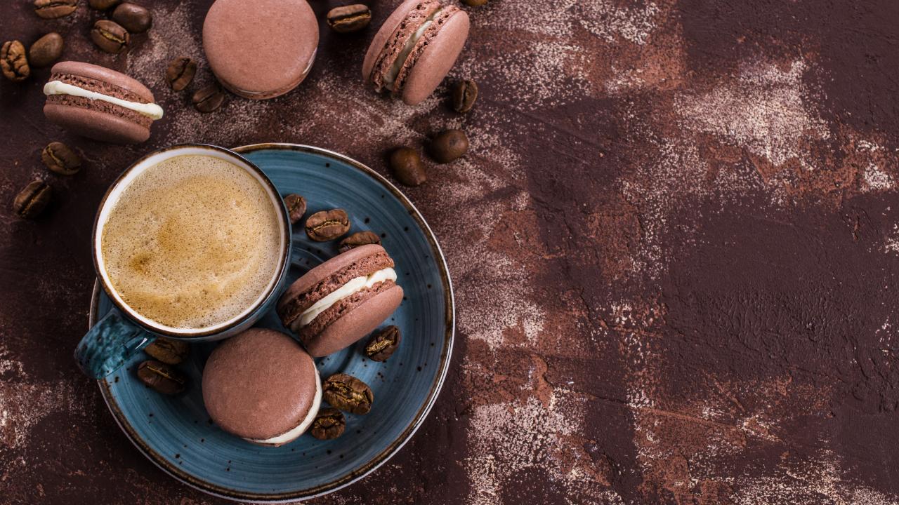 Wallpaper A cup of coffee with chocolate macaroons on the table