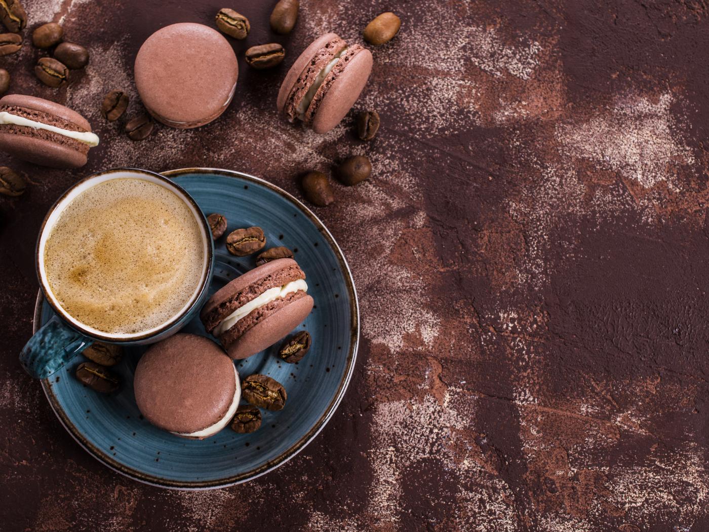 Wallpaper A cup of coffee with chocolate macaroons on the table