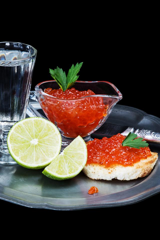 Wallpaper Sandwiches with red caviar on a tray with a glass of vodka and lime