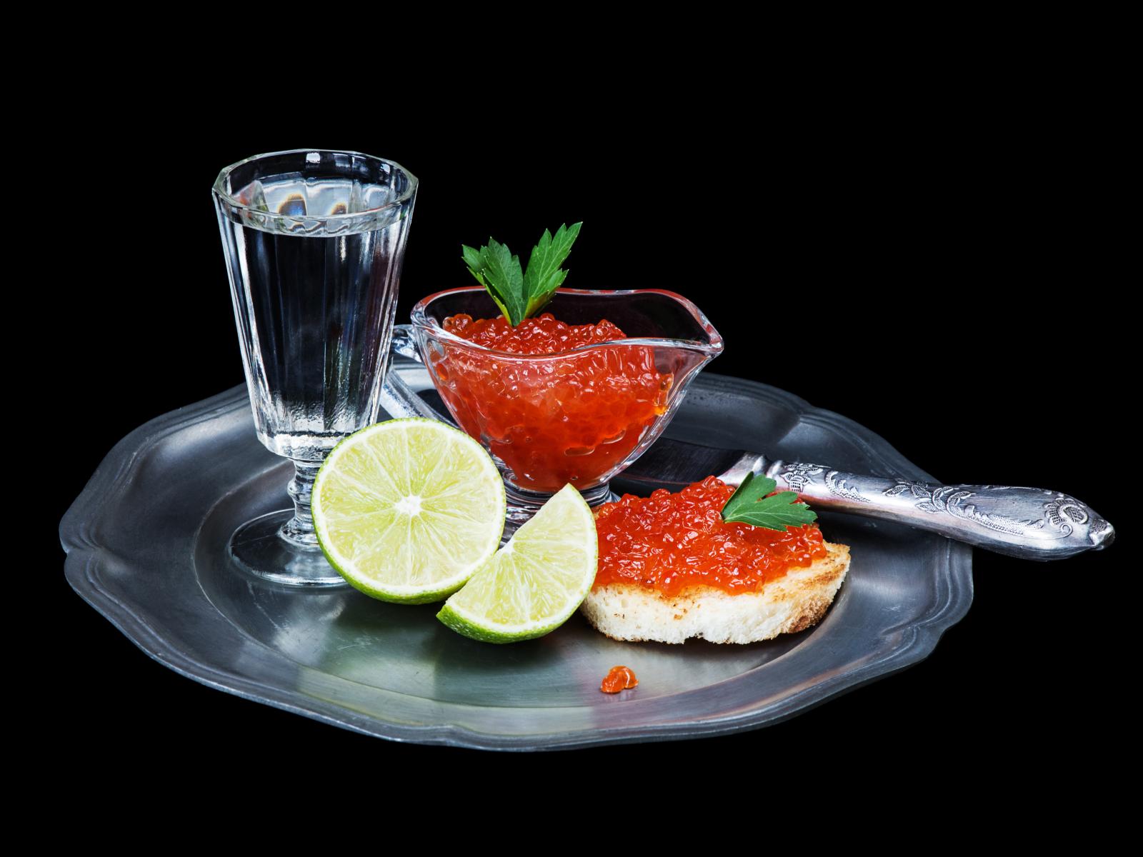 Wallpaper Sandwiches with red caviar on a tray with a glass of vodka and lime