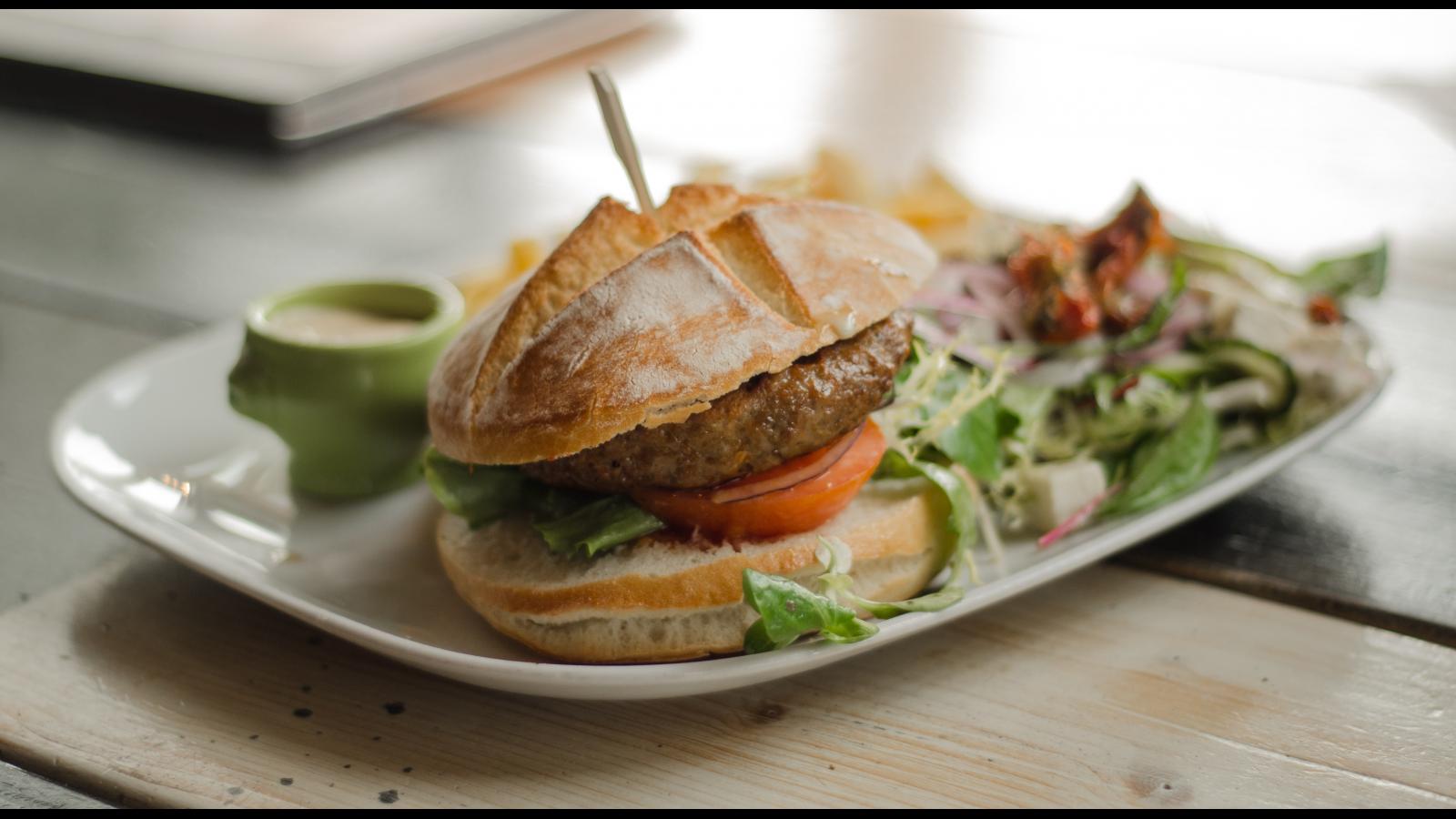 Wallpaper Hamburger on a plate with salad