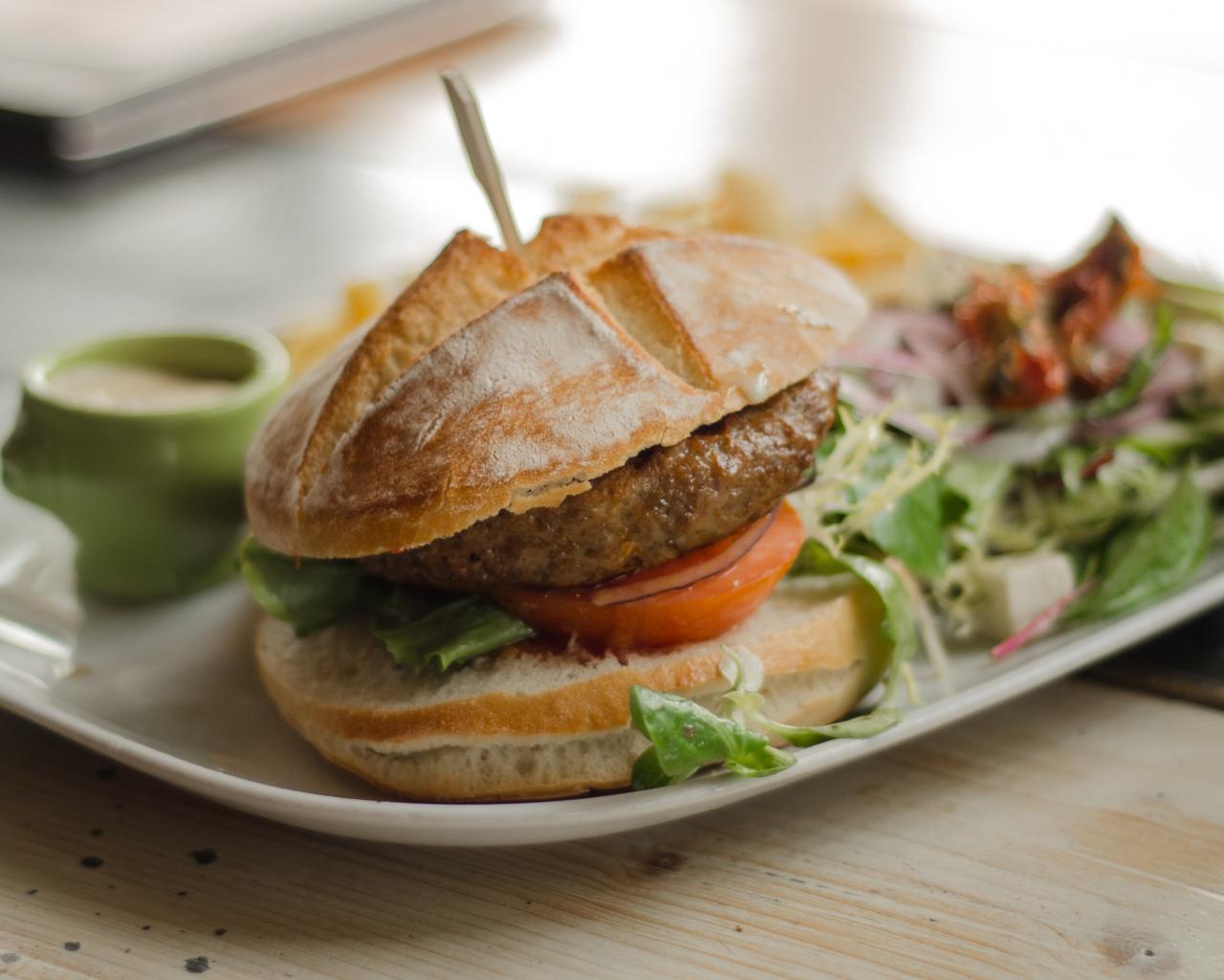 Wallpaper Hamburger on a plate with salad