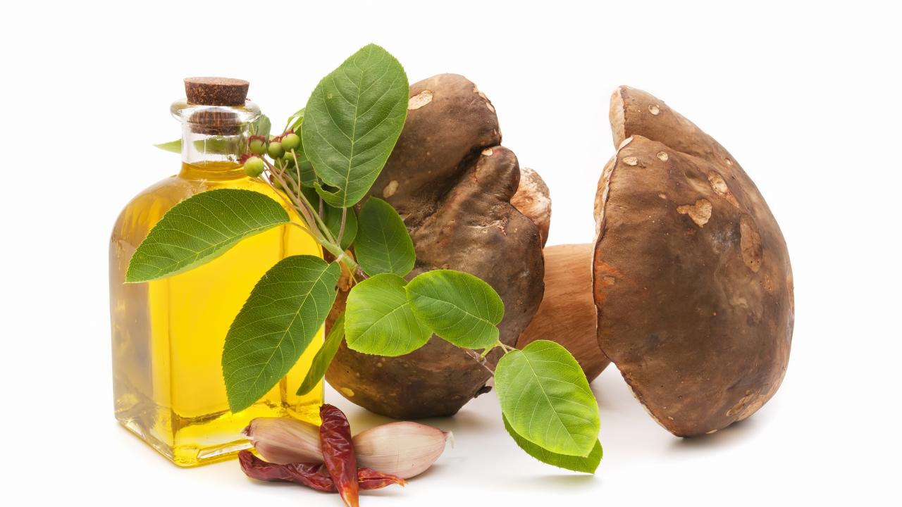 Wallpaper Mushrooms on a white background with olive oil and garlic