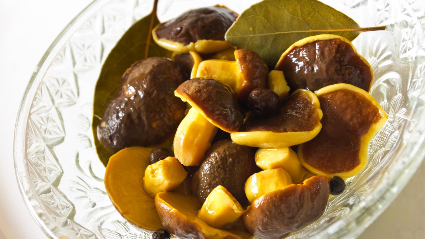 Wallpaper Delicious marinated mushrooms in a glass salad bowl