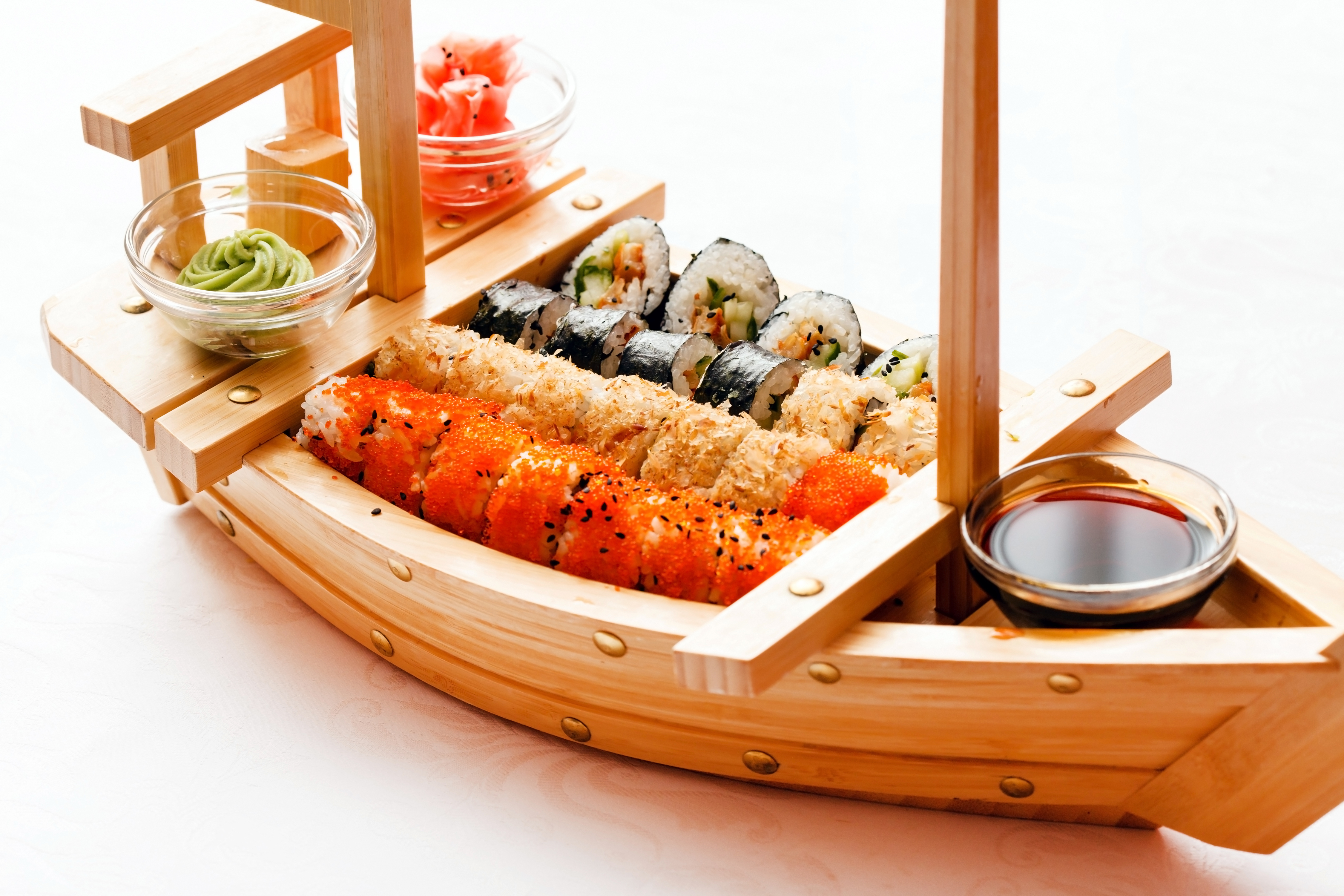 Wallpaper Wooden ship with sushi, sauce and ginger