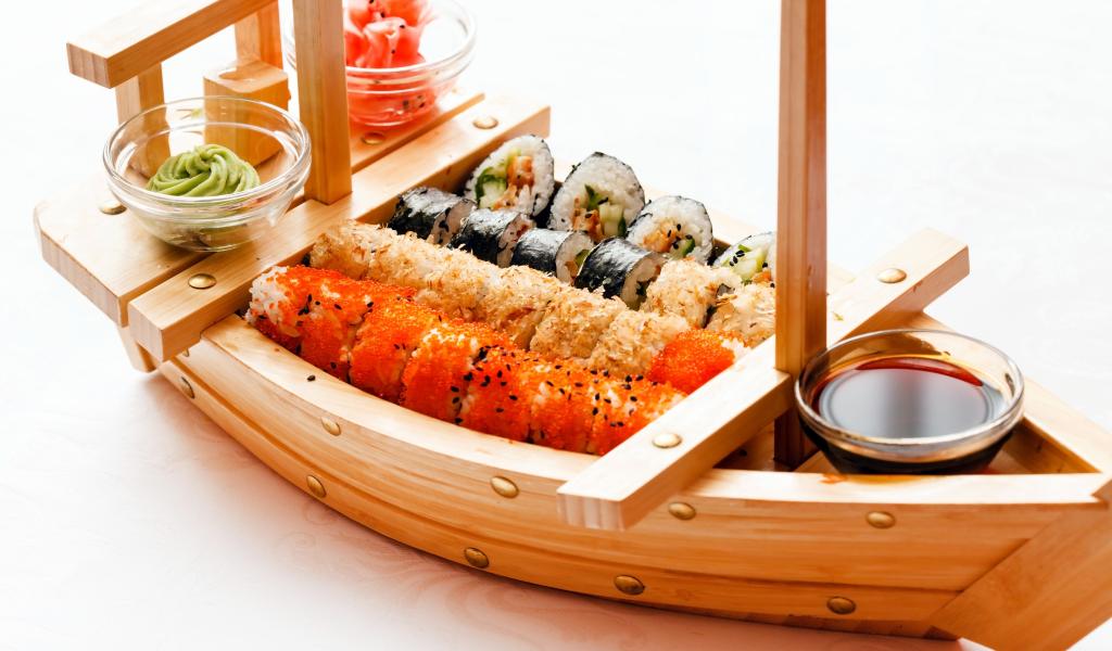 Wallpaper Wooden ship with sushi, sauce and ginger
