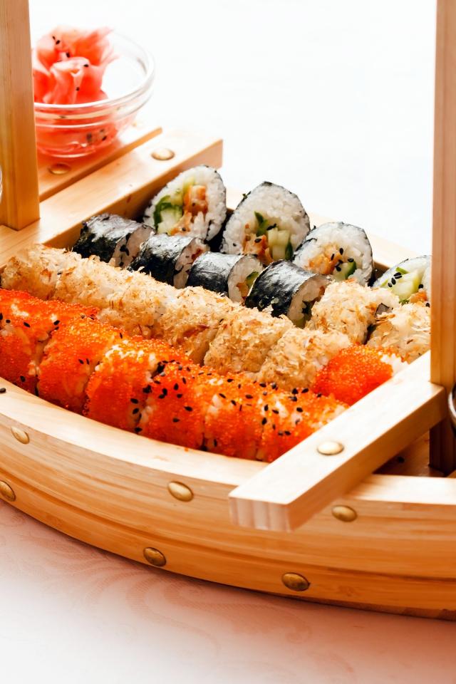 Wallpaper Wooden ship with sushi, sauce and ginger