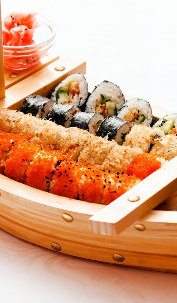 Wallpaper Wooden ship with sushi, sauce and ginger