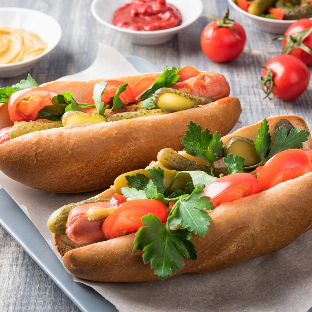 Wallpaper Two hotdogs with sausage, cucumbers and tomatoes
