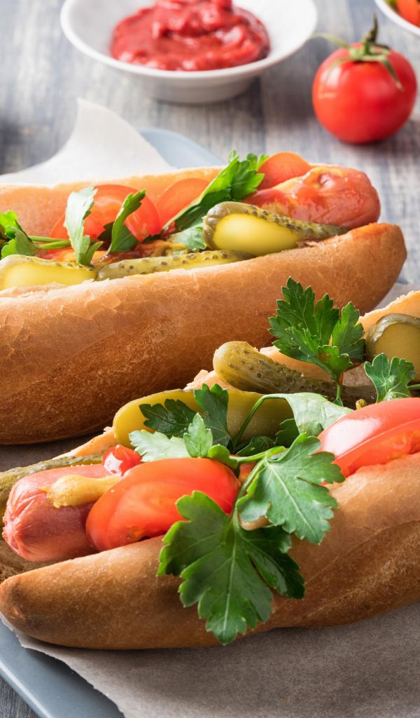 Wallpaper Two hotdogs with sausage, cucumbers and tomatoes