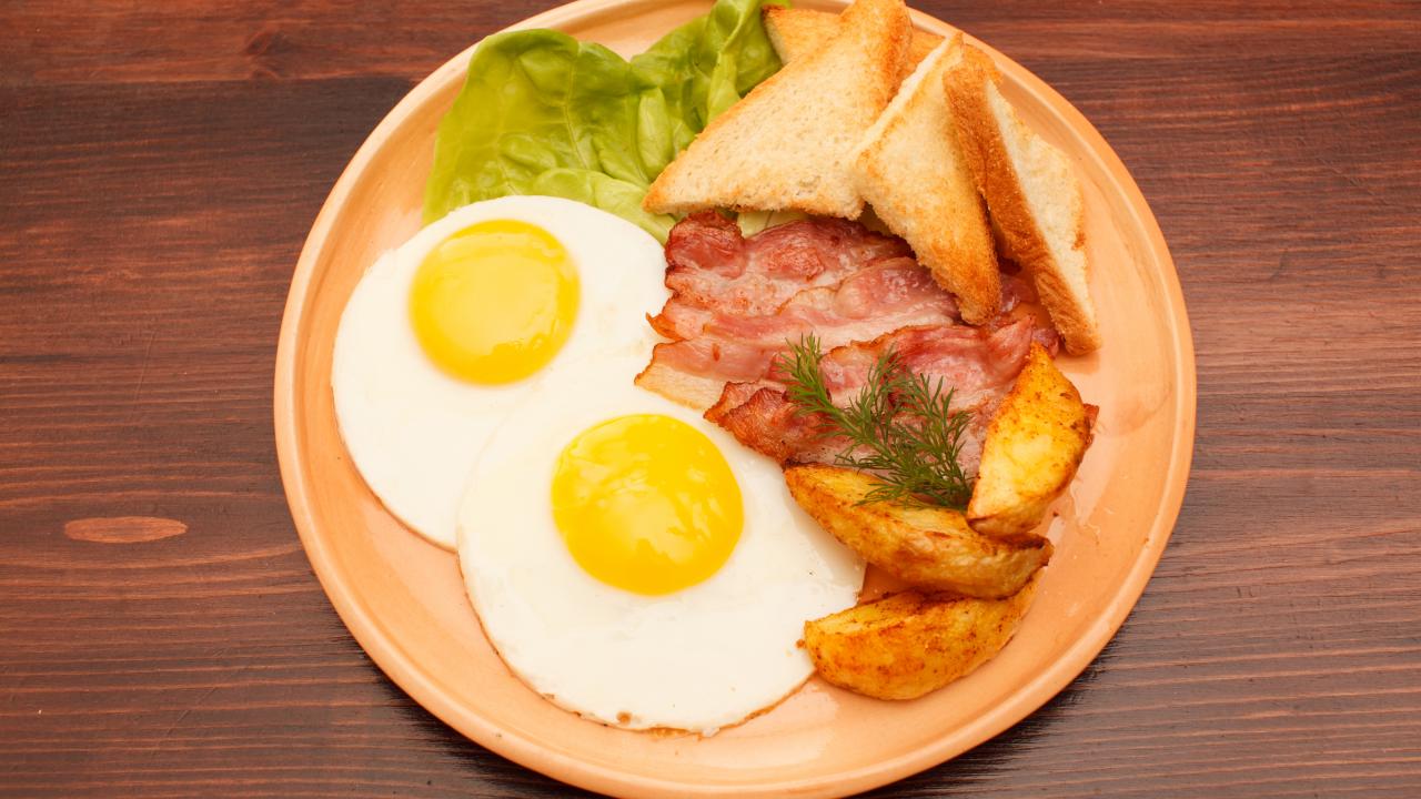 Wallpaper Fried eggs with bacon, french fries and croutons on the table