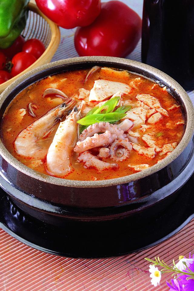 Wallpaper Plate of red seafood soup on the table with vegetables