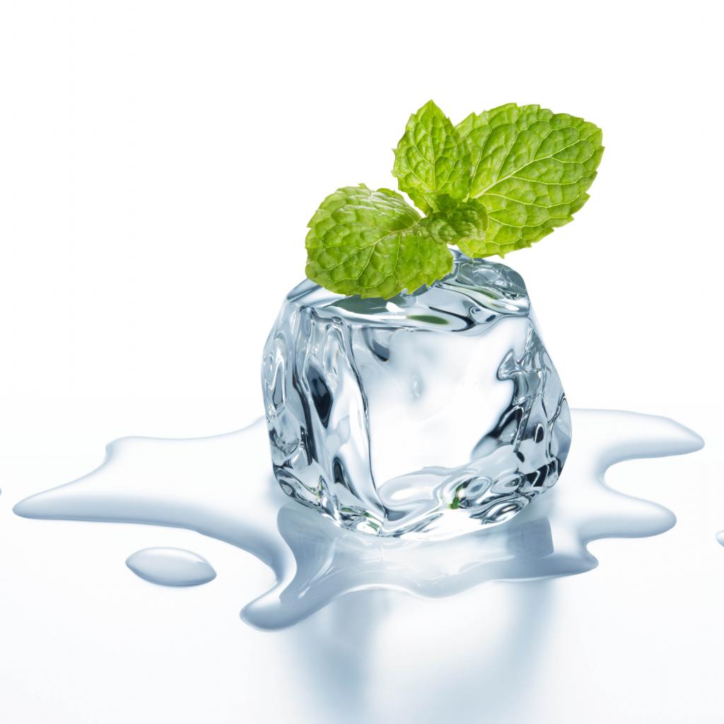 » Wallpaper Melting ice cube with a leaf of mint on a white background