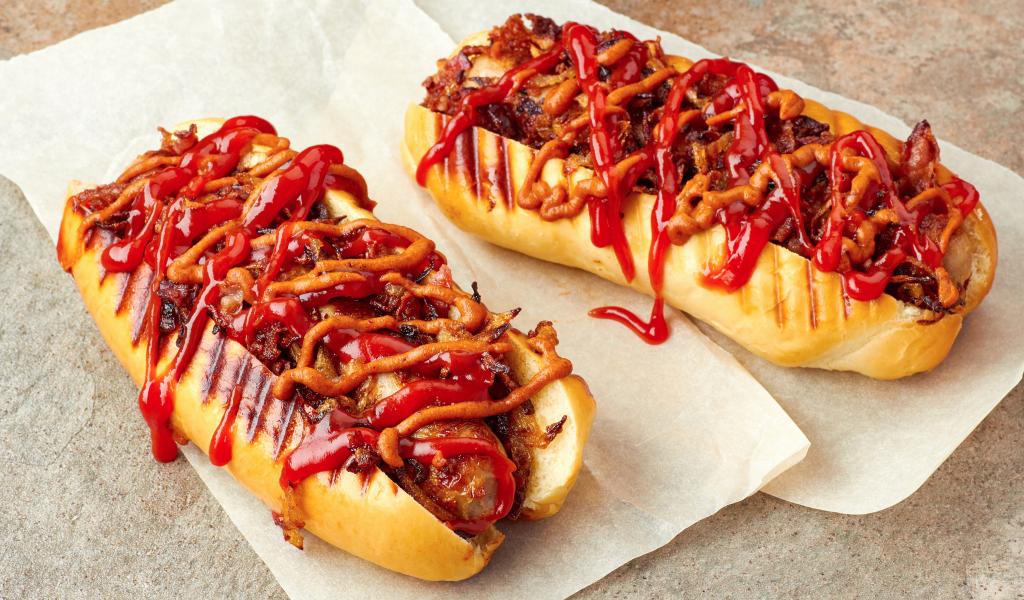 Wallpaper Grilled hotdogs with sausages and sauce