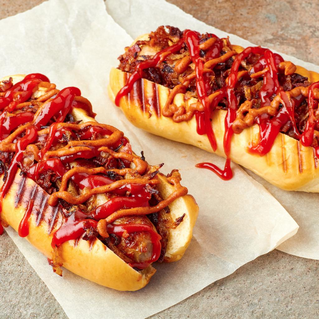 Wallpaper Grilled hotdogs with sausages and sauce