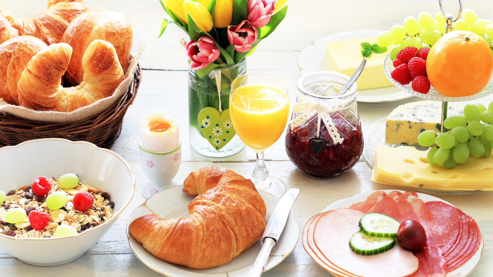 Wallpaper Breakfast on the table with a bouquet of tulips