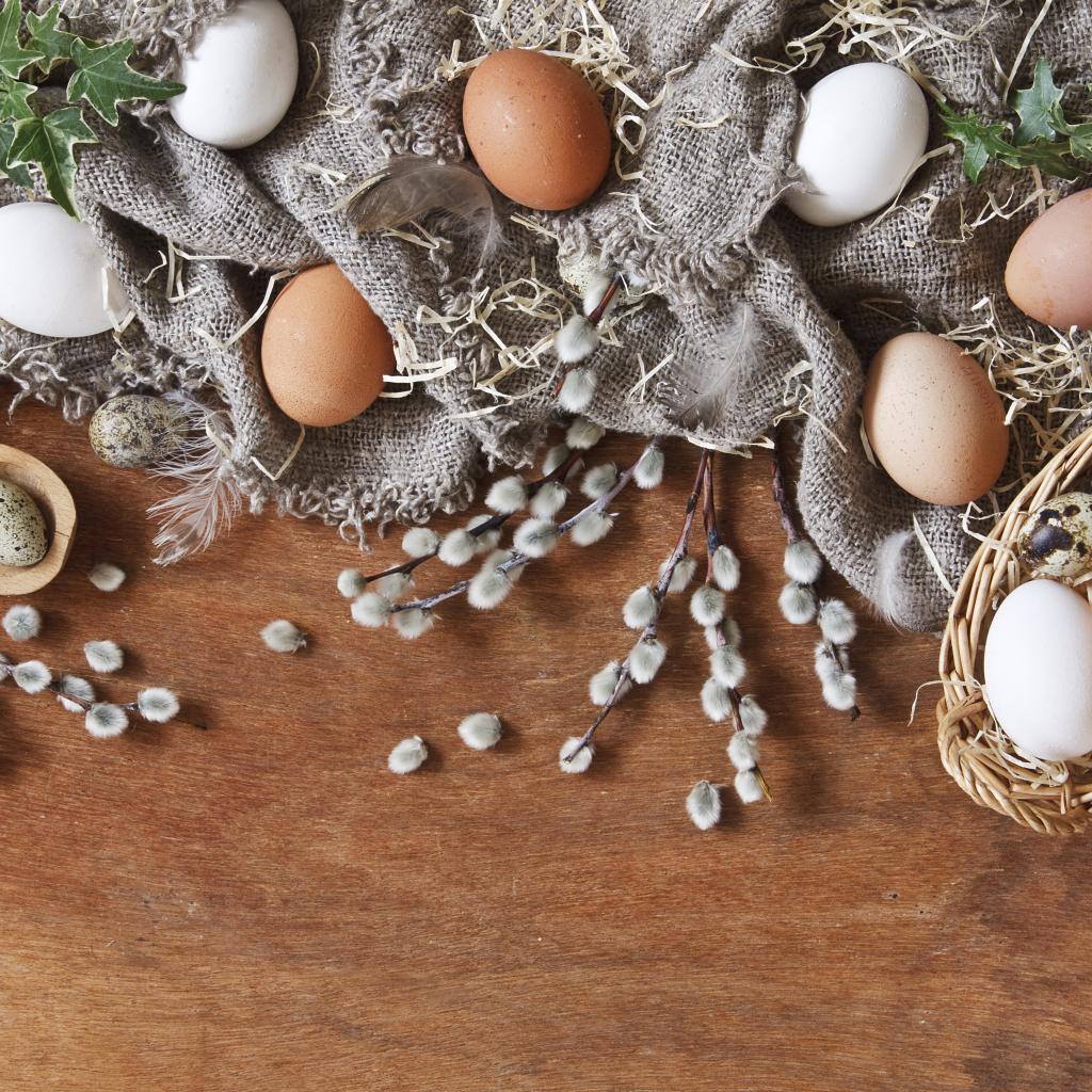 Wallpaper Chicken and quail eggs on the table in willow branches