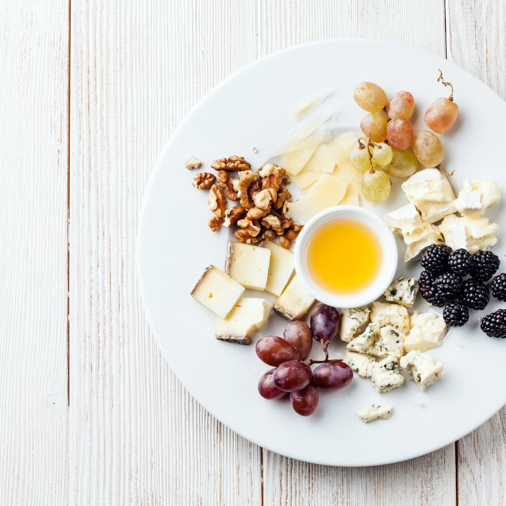Wallpaper Chunks of cheese on a plate with nuts, grapes, honey and blackberries