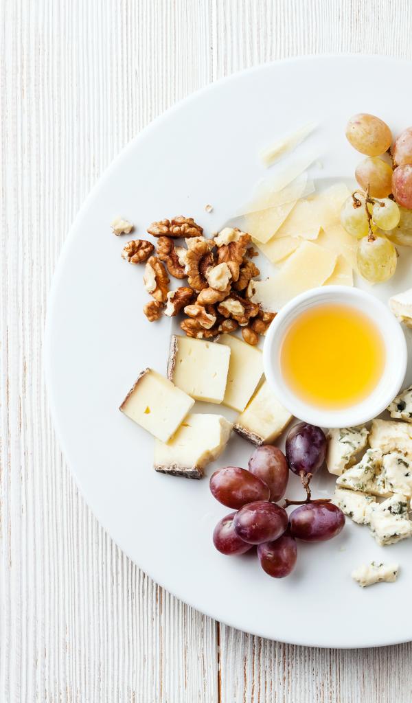 Wallpaper Chunks of cheese on a plate with nuts, grapes, honey and blackberries
