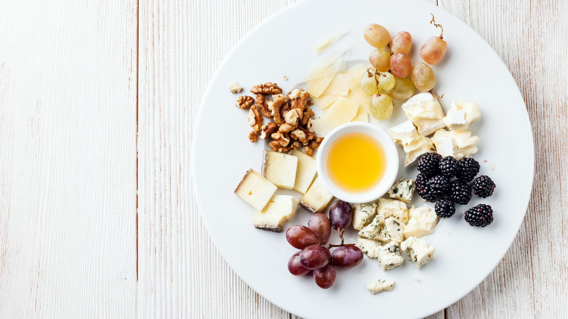 Wallpaper Chunks of cheese on a plate with nuts, grapes, honey and blackberries