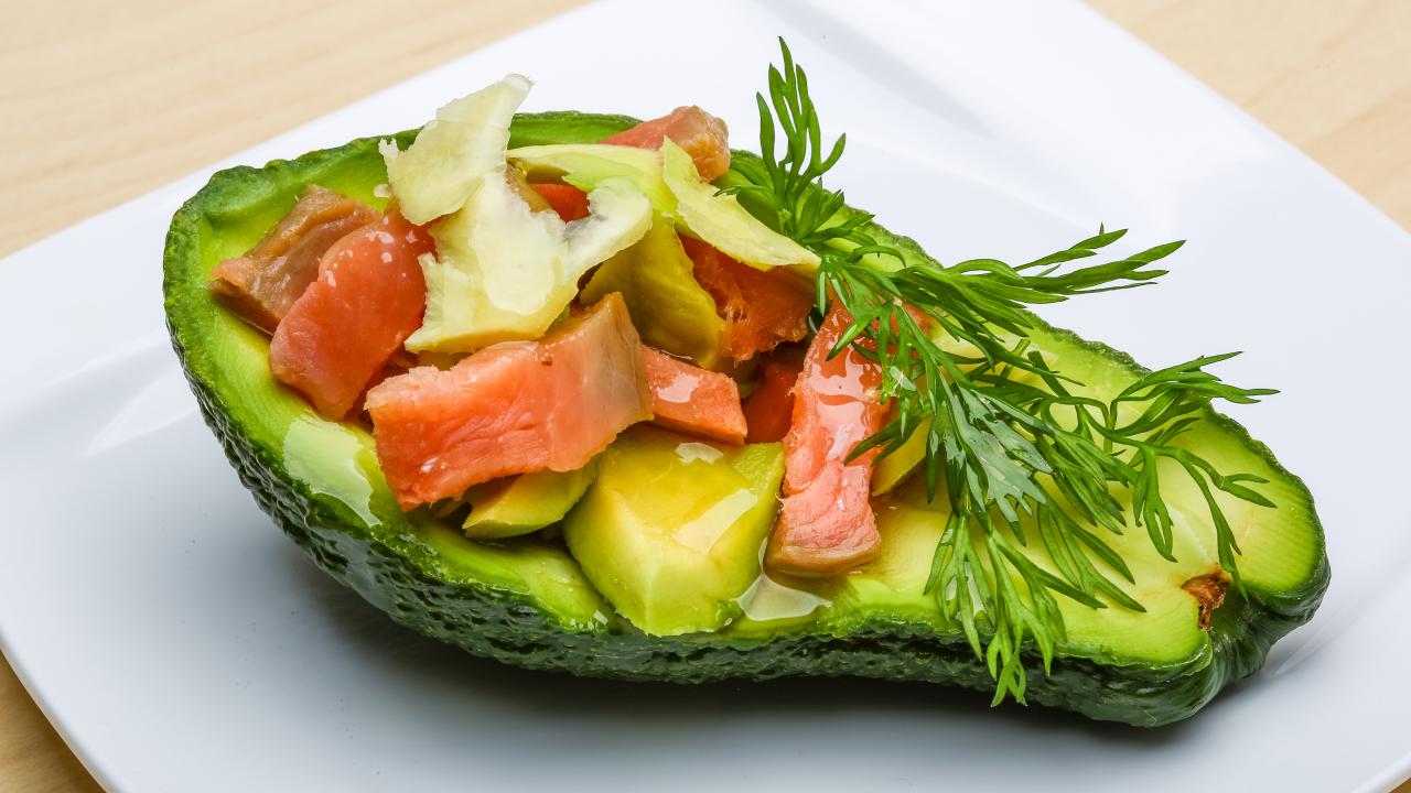 Wallpaper Salad with fish and a sprig of dill in avocado