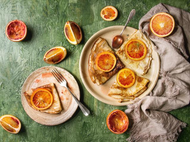 Wallpaper Thin pancakes with oranges on the table