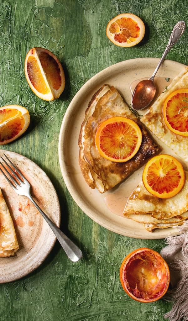 Wallpaper Thin pancakes with oranges on the table