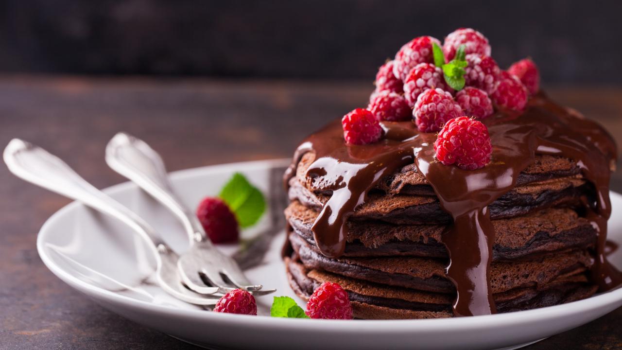 Wallpaper Chocolate Pancakes on a Plate with Chocolate and Raspberry Berries