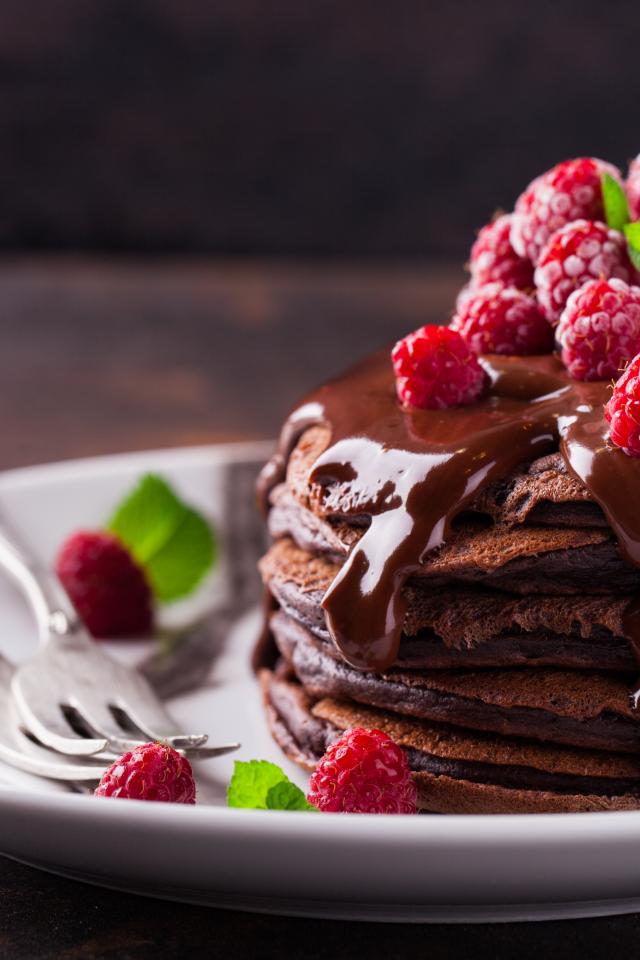 Wallpaper Chocolate Pancakes on a Plate with Chocolate and Raspberry Berries