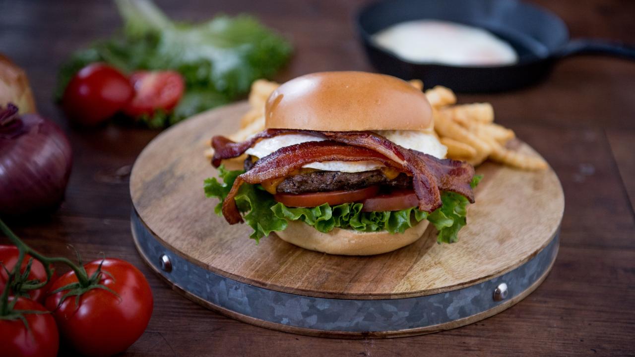 Wallpaper Hamburger with bacon on the table with vegetables