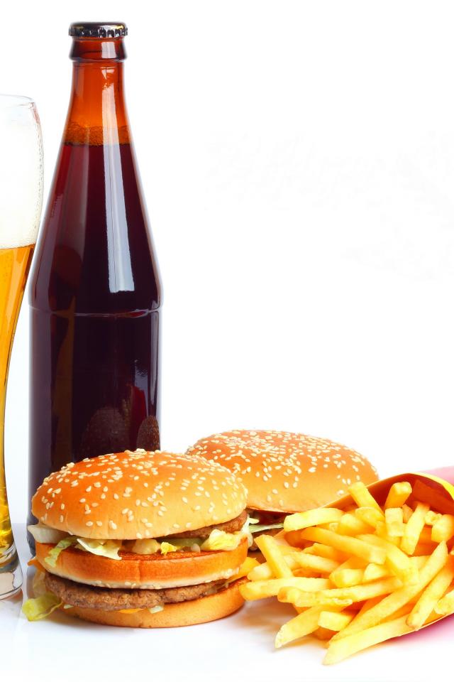 Wallpaper Beer on a white plate with hamburgers and french fries.