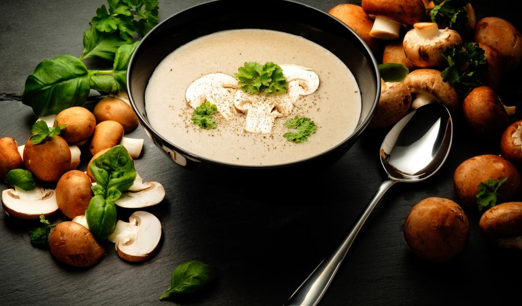 Wallpaper Mushroom soup puree on a table with champignons
