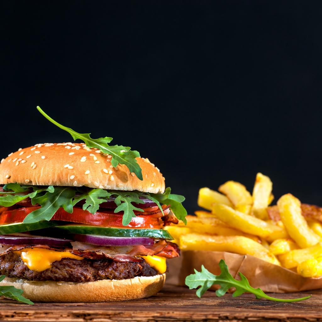 Wallpaper Tasty burger on the table with french fries