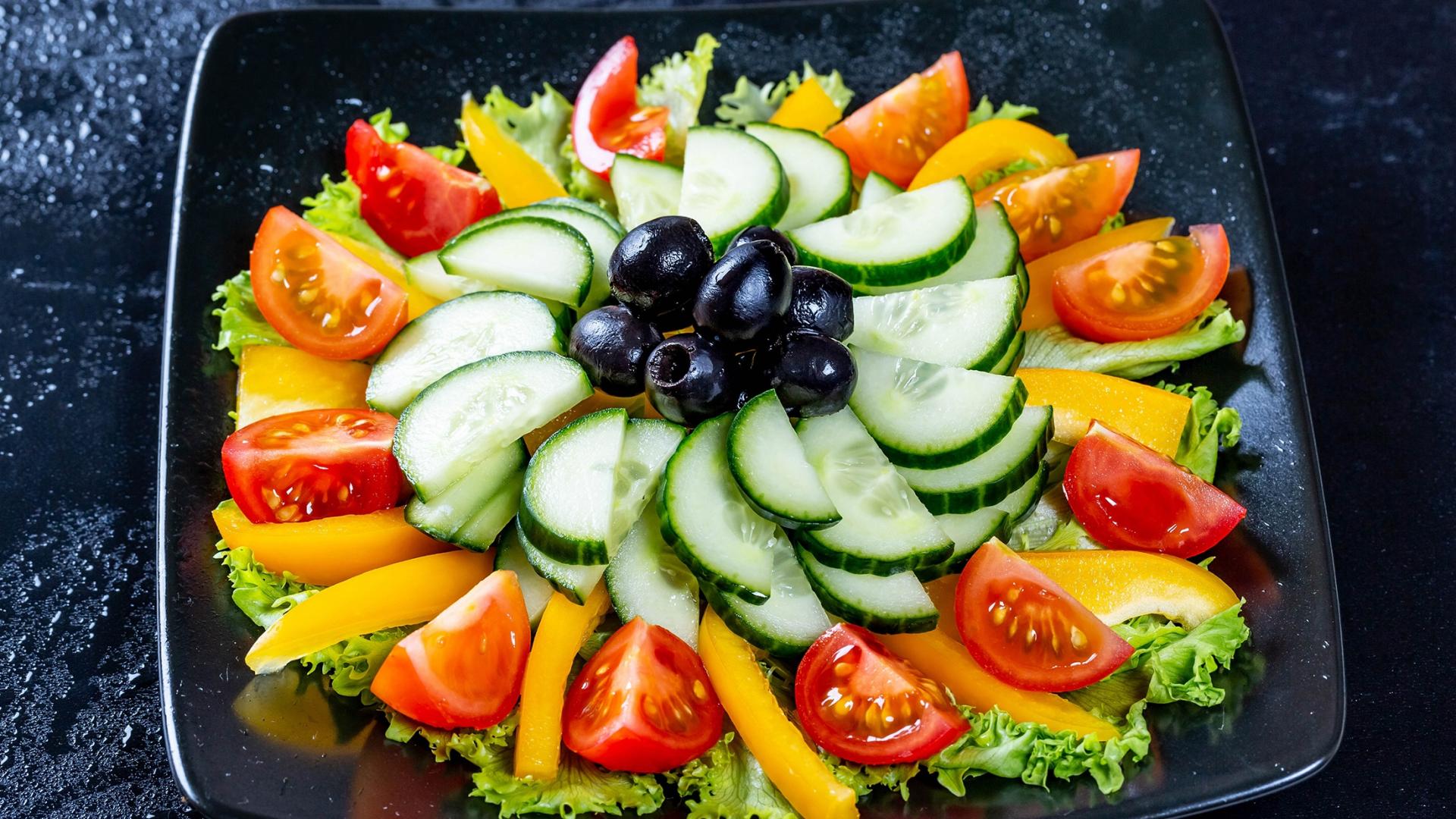 Wallpaper Tomato, cucumber and pepper salad on a plate with lettuce and olives
