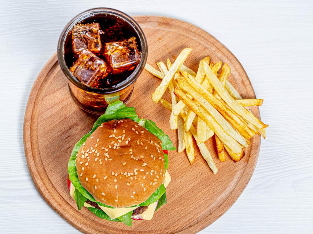 Wallpaper Hamburger on a board with fries and cola