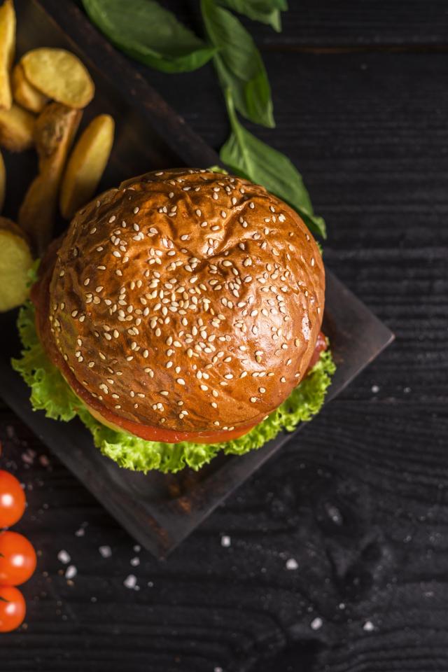 Wallpaper Hamburger with potatoes on a table with tomatoes