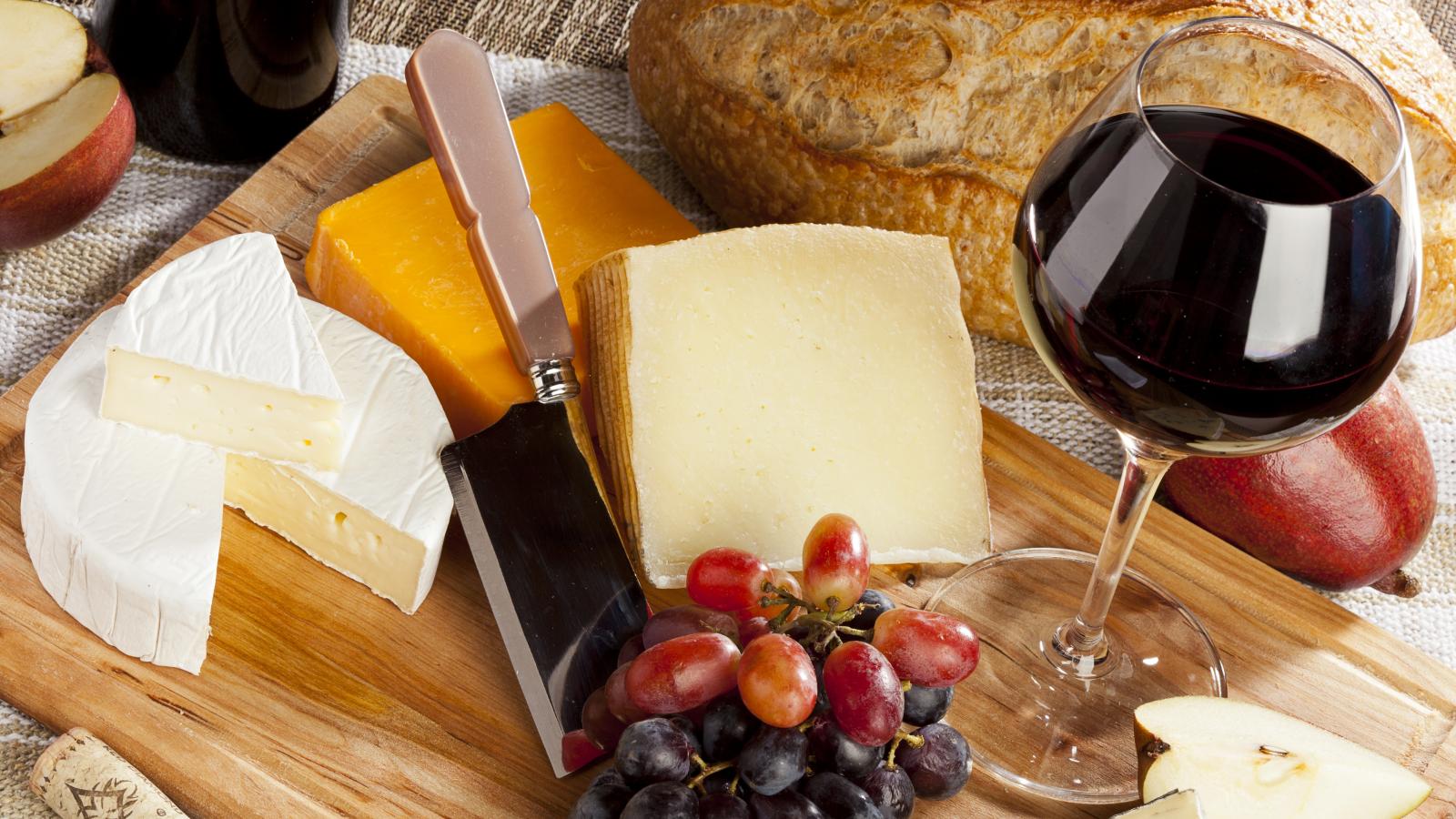 Wallpaper Cheese on the table with grapes and wine.