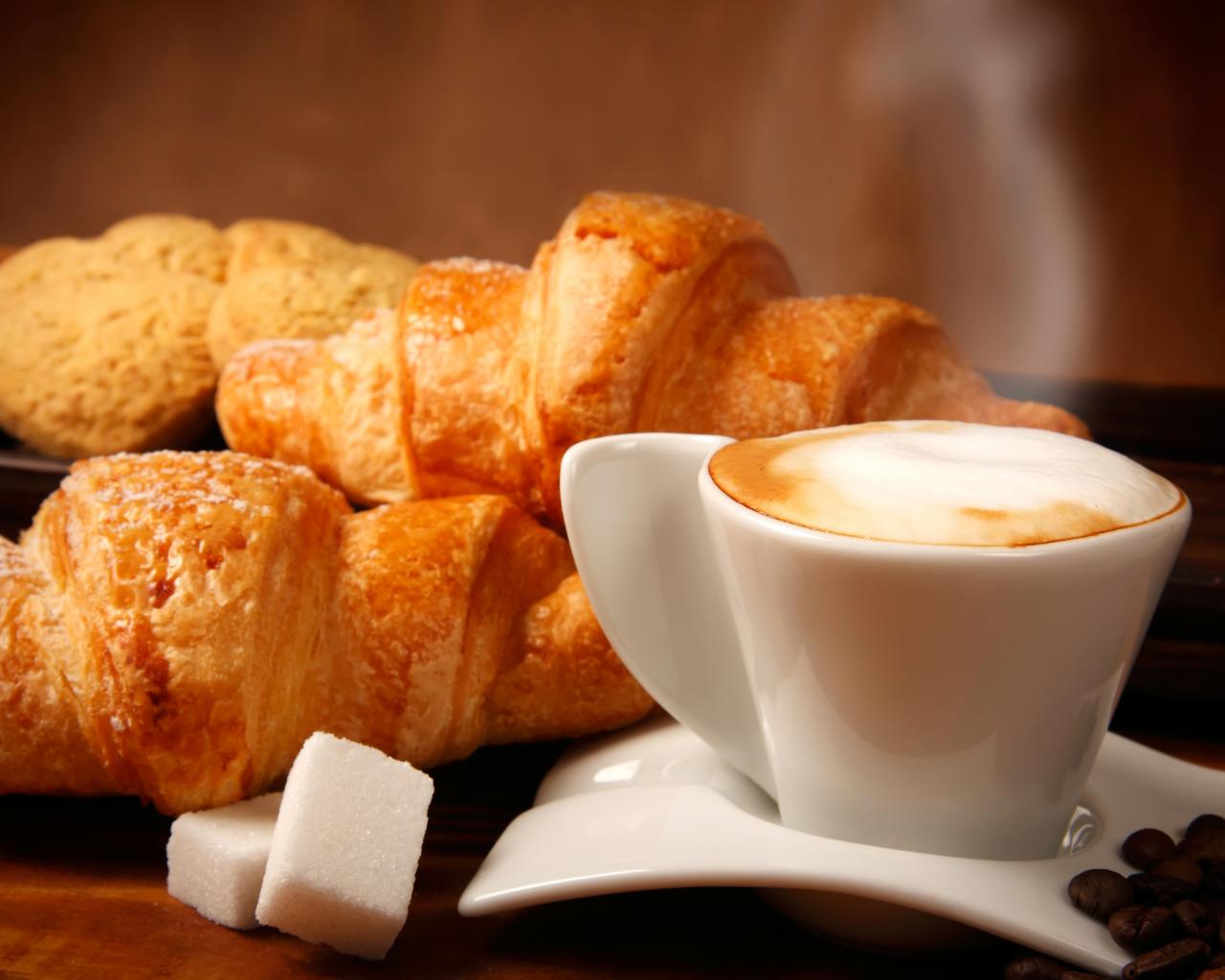 Wallpaper Coffee on a table with fresh croissants and slices of sugar