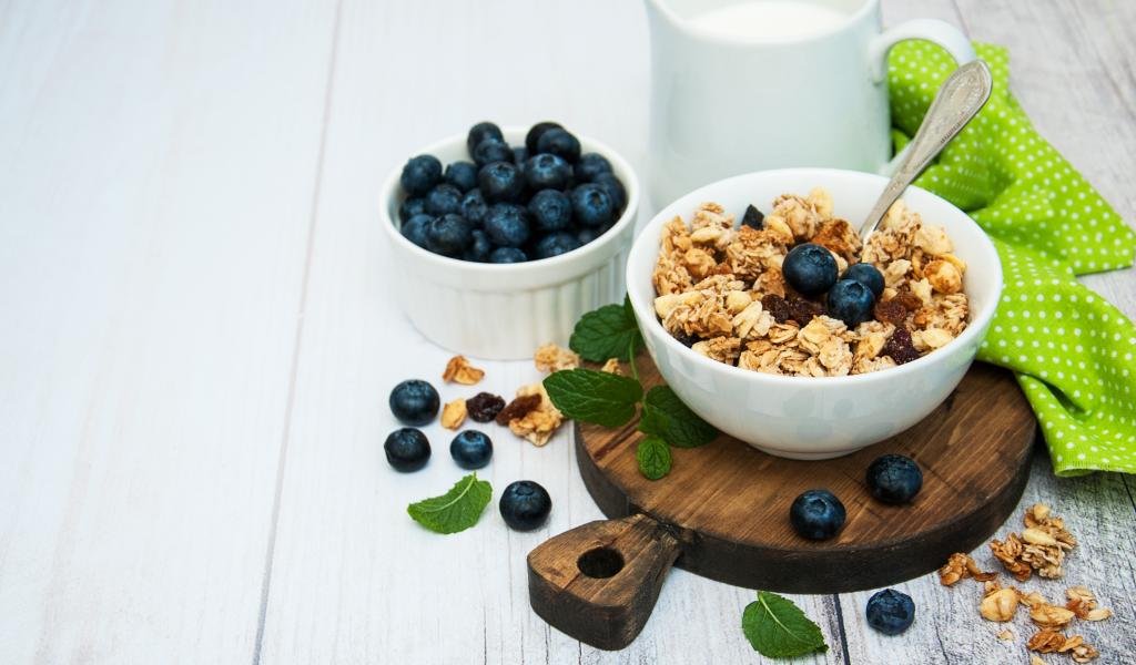 Wallpaper Cereals with blueberries on a table with milk