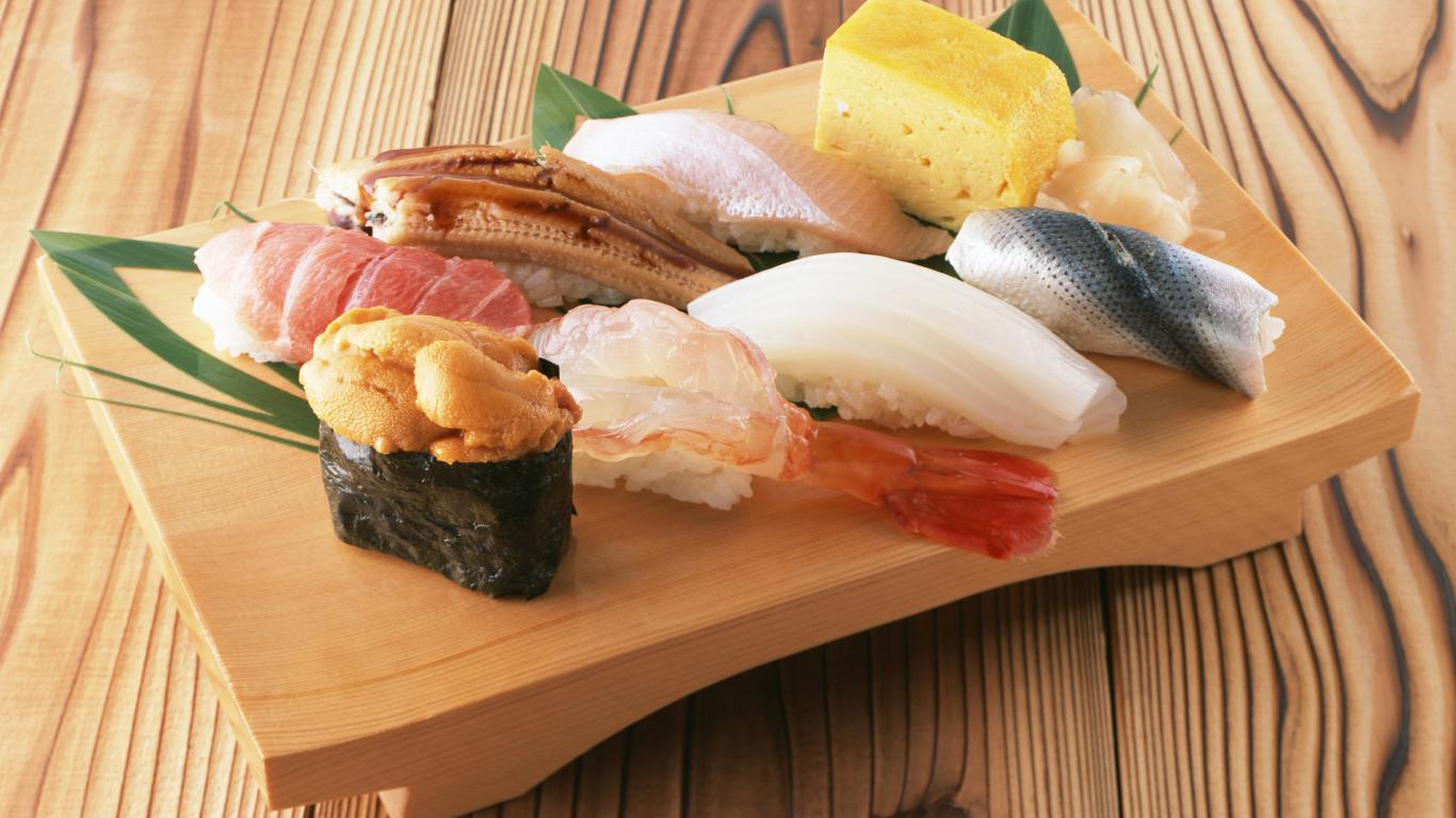 Wallpaper Appetizing Japanese sushi on a wooden board