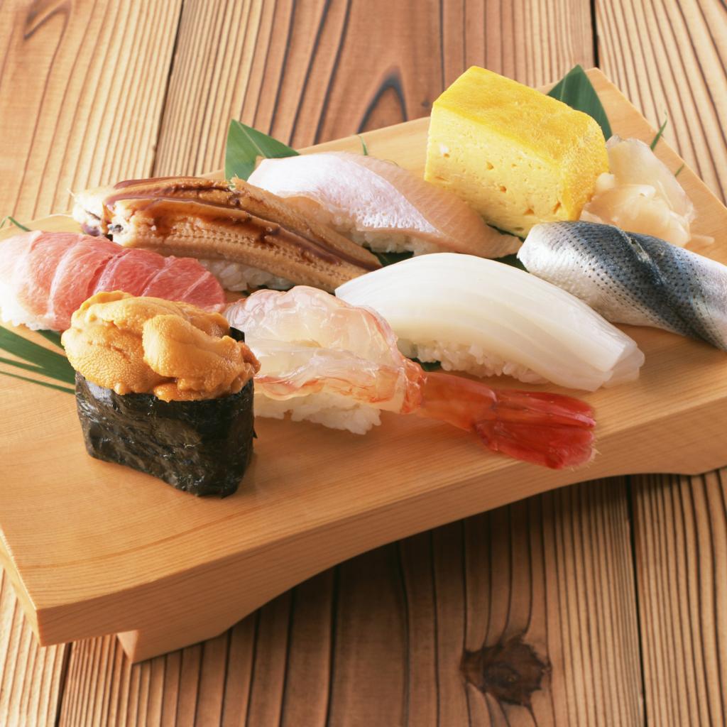 Wallpaper Appetizing Japanese sushi on a wooden board