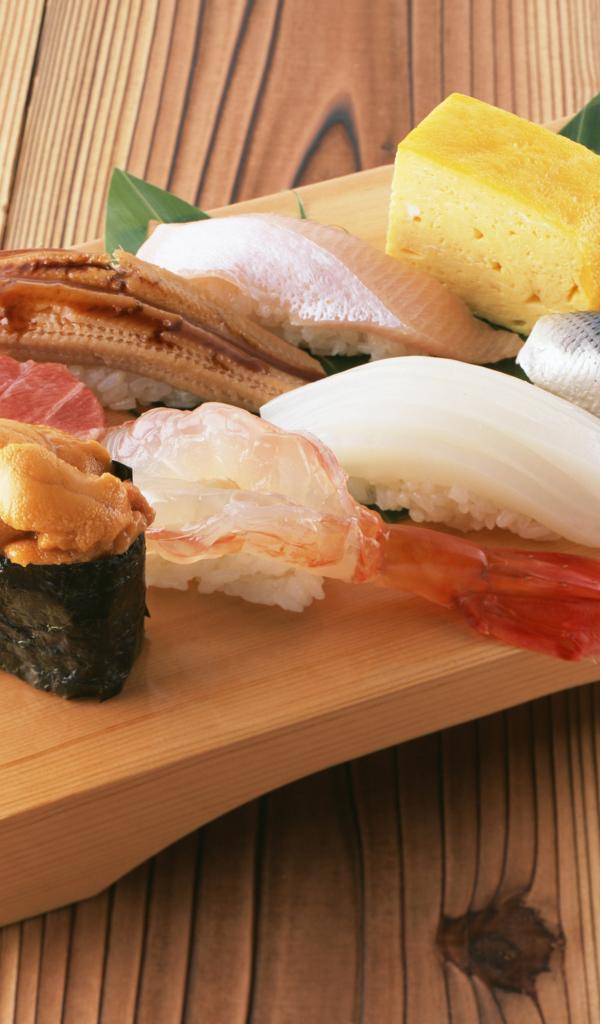 Wallpaper Japanese sushi on a wooden board with seafood