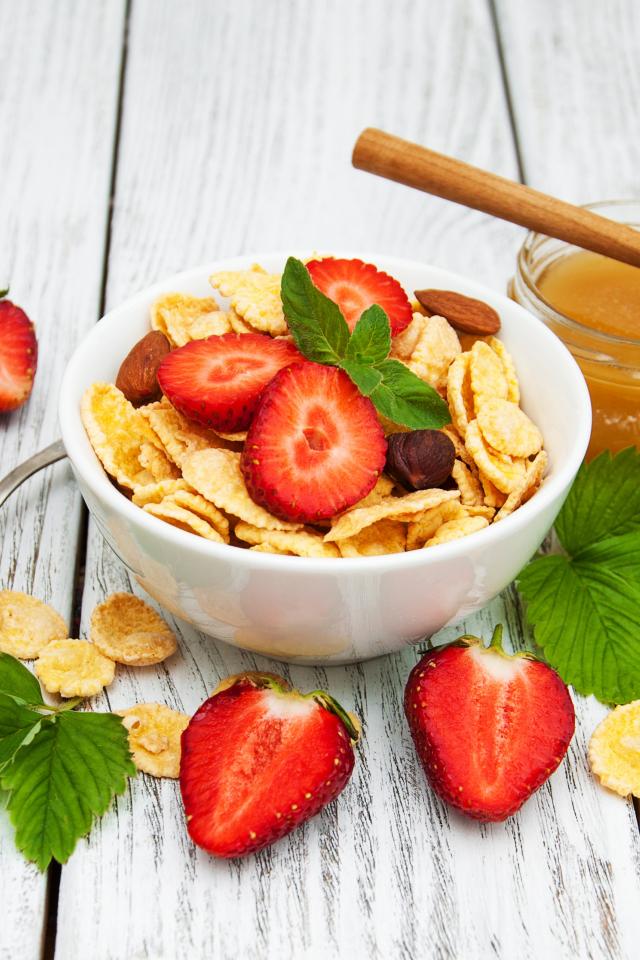 Wallpaper Cornflakes in a bowl with strawberries and honey