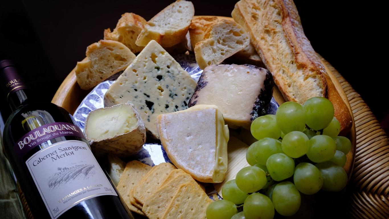 Wallpaper Different types of hard cheese on a plate with white grapes and wine
