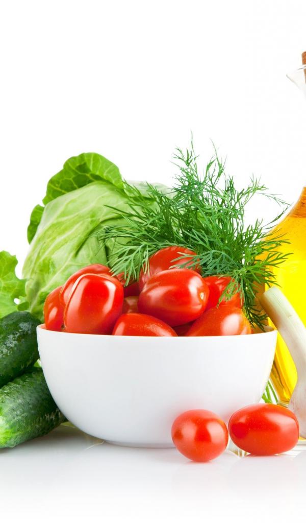 Wallpaper Fresh vegetables on a table with olive oil on a white background