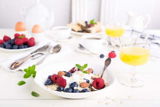 Wallpaper Oatmeal on a table with blueberries, raspberries and nuts