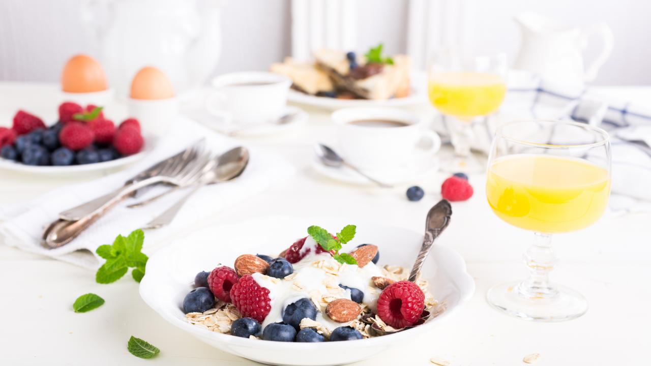 Wallpaper Oatmeal on a table with blueberries, raspberries and nuts