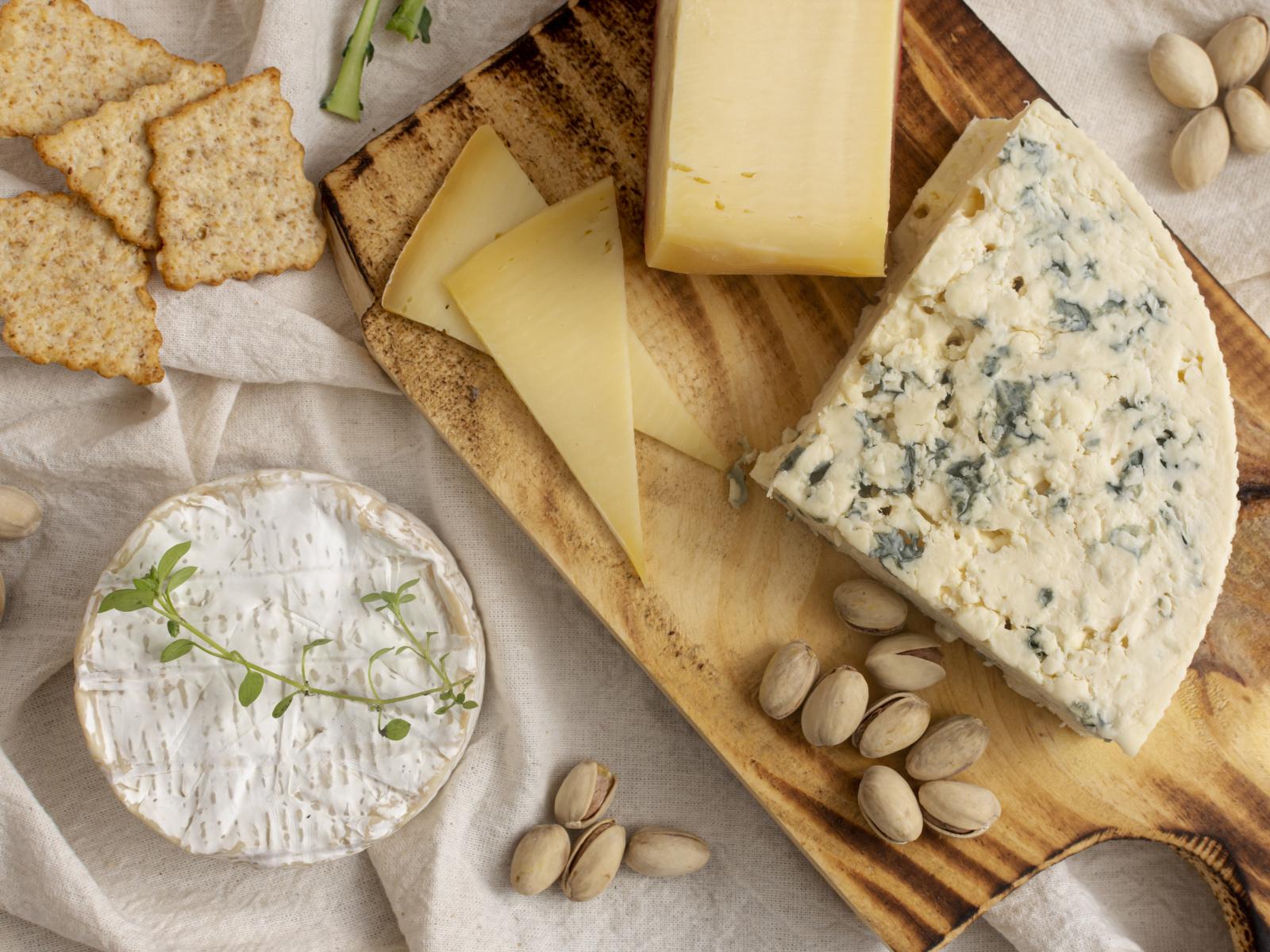 Wallpaper Blue cheese on a table with cookies and pistachios