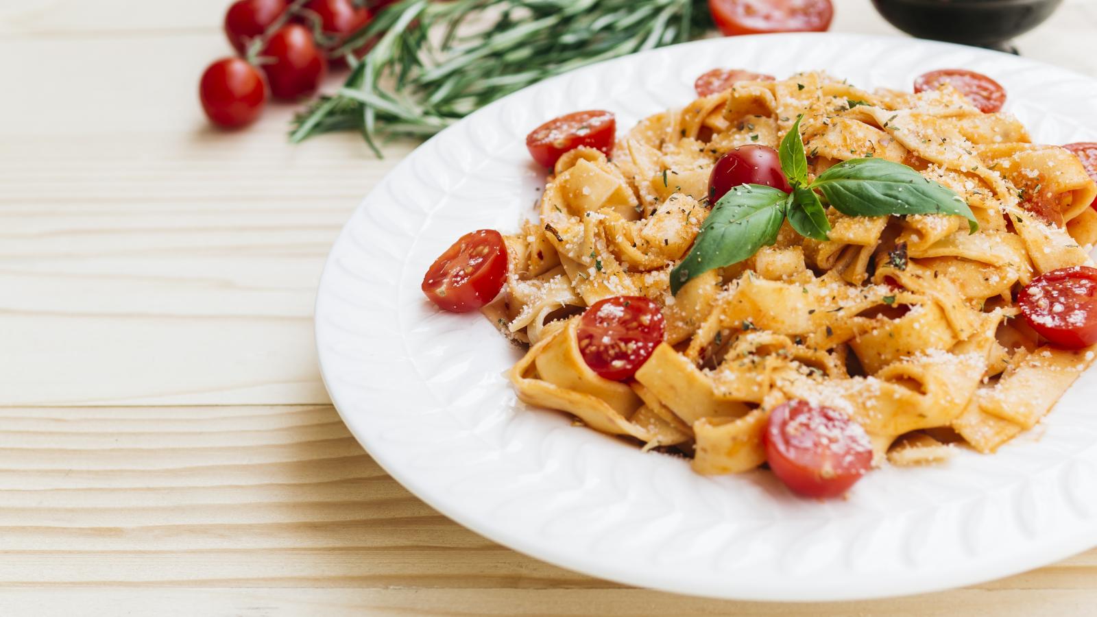 Wallpaper Pasta with cherry tomatoes on a white plate
